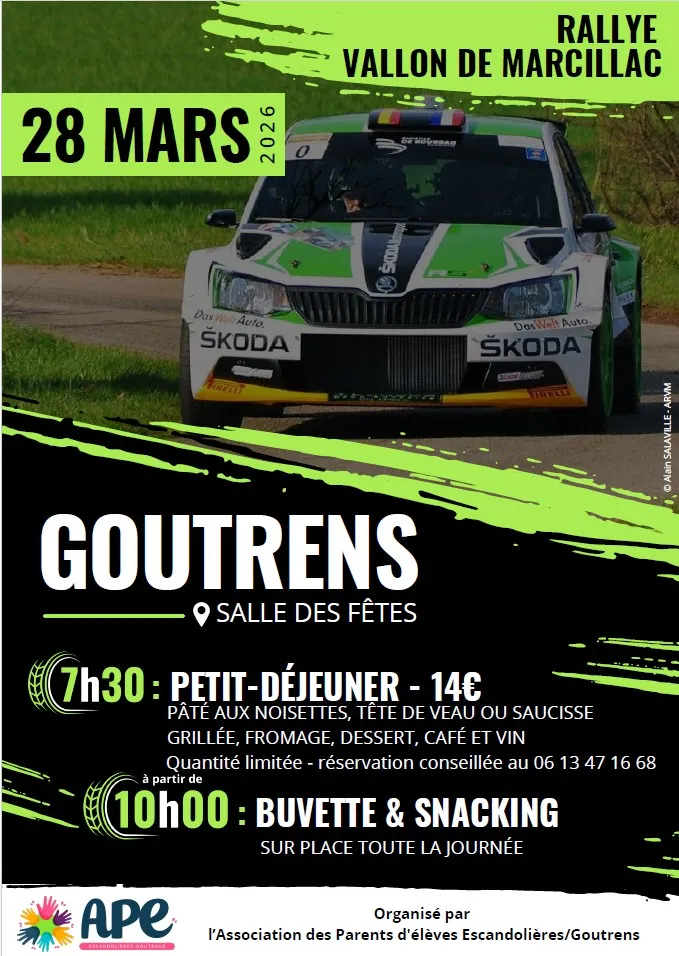L’A.P.E. profite du passage du rallye du vallon de Marcillac pour organiser : un petit-déjeuner salé à partir de 7h30 au tarif de 14€ à la salle des fêtes de Goutrens.