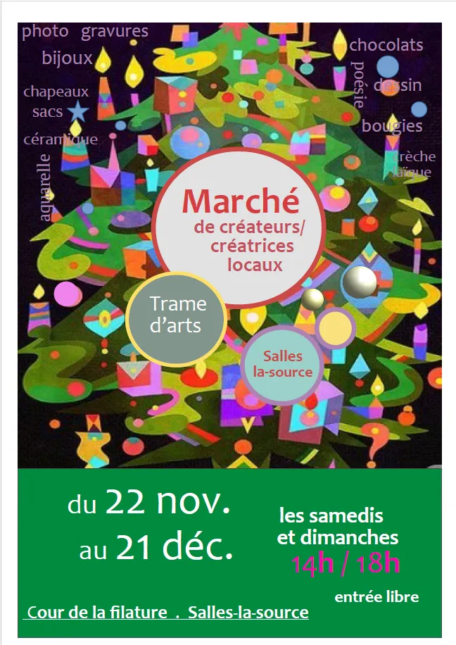 Marché de noël des créateurs, du samedi 22 novembre jusqu’au dimanche 21 décembre, à la maison Trames d’Art, à Salles-la-Source.