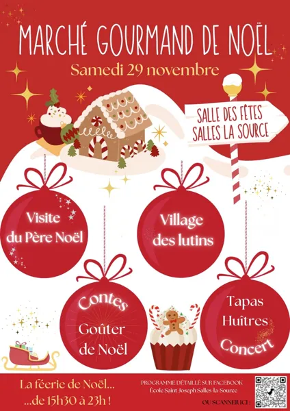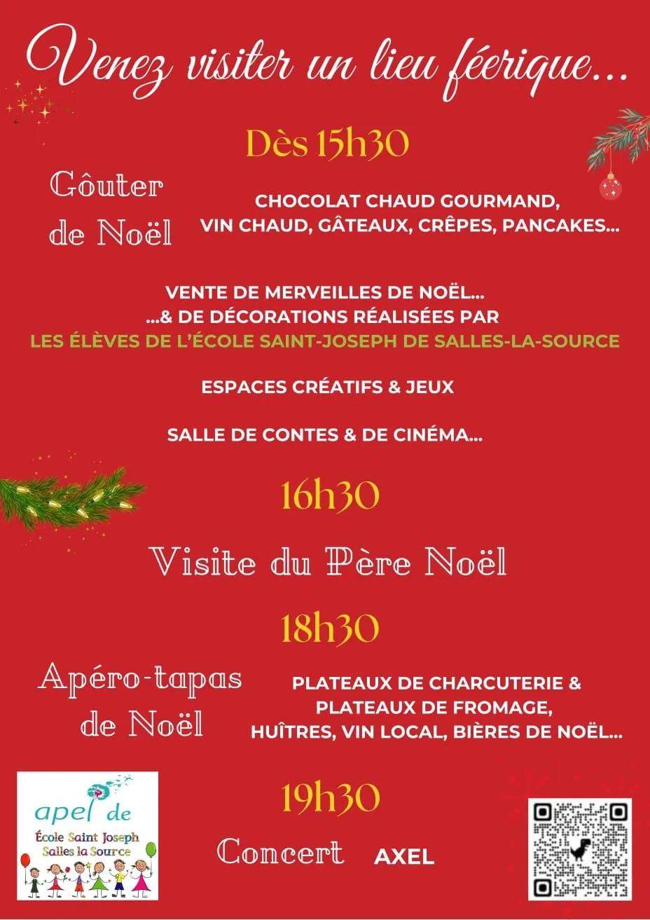 Vente de sapins de Noêl, visite du Père Noêl, goûter et gourmandises, décorations faites par les enfants, repas du soir et concert vous attendent!