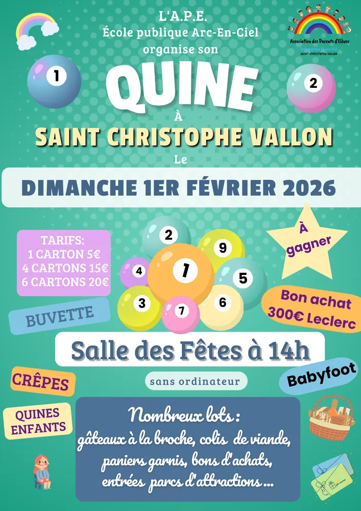 Quine de l’APE de l’école publique Arc-en-ciel de Saint Christophe Vallon le dimanche 1er février.