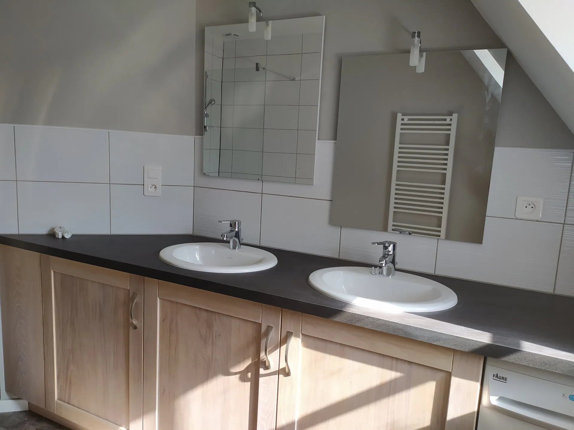 Une deuxième salle de bain à l’étage avec douche, deux vasques, sèche serviette, et lave linge.
