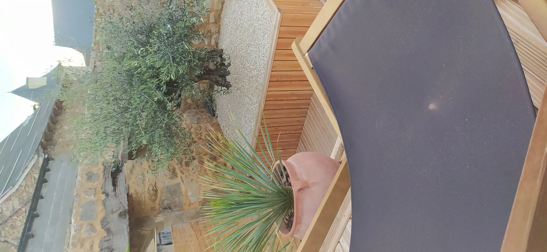 Une grande terrasse qui donne sur une cour intérieure et un espace vert, ainsi qu’une piscine à partager